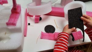 Hier sind Kinder als Konstrukteure, Erfinder und Designer im einfallsreich tätig. Aus unterschiedlichen Schaumstoffelementen wurden durch Steckverbindungen und durch den Einsatz von Gummibädern und Holzspießen fantastische Bauten und Objekte hergestellt.